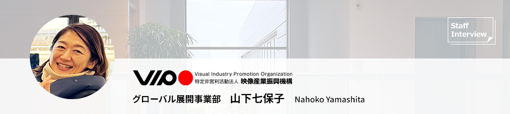 特定非営利活動法人映像産業振興機構(VIPO)の最前線で活躍する社員に焦点を当てる本企画。今回は、グローバル展開事業部でマネージャーを務める山下七保子さんにお話を伺いました。長年、東京国際映画祭の広報や運営に携わってきた「映画祭のプロ」としての知見を活かし、現在は日本のクリエイターが世界へ羽ばたくための「伴走支援」に尽力されています。仕事のやりがいや今後の展望について詳しくお話を伺いました。