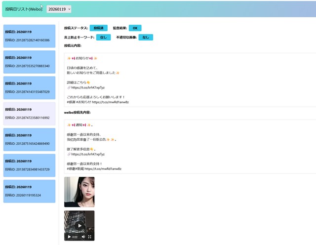 本システムでは、日本公式サイトや日本運営SNSの記事を自動で取得し、中国SNS向けにAI翻訳・ローカライズし、またローカライズ後の内容を炎上防止AIが解析してから中国SNSへ記事投稿する機能を実現した。
