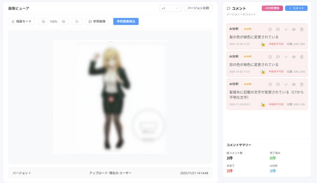 本システムは、監修対象物をAIが自動解析し、テキスト、色彩、シルエット、NG項目等を即時にチェックする機能を備えるとともに、関係者間のやり取りをシステム上で完結させることで、情報共有の円滑化と管理の一元化を実現した。