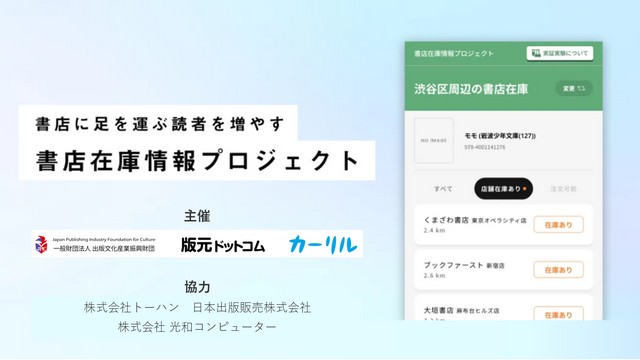 本事業は街の書店の来客を増やし、地域図書館と書店の連携を拡大することを目的として実施した。書店の在庫情報を一般公開するシステム「書店在庫情報プロジェクト」に対し、取引書店の在庫情報を開示連携するための開発を行った。7月~売れ筋銘柄を選定し対象店の在庫データを抽出・日次で伝送するシステム開発を行い、8月~書店案内のうえ133店に在庫開示許可を取った。11月にシステム検証を行い、12月8日より本稼働させた。稼働後は業界紙にリリースを打ち、図書館や書店への連携拡大を進めた。